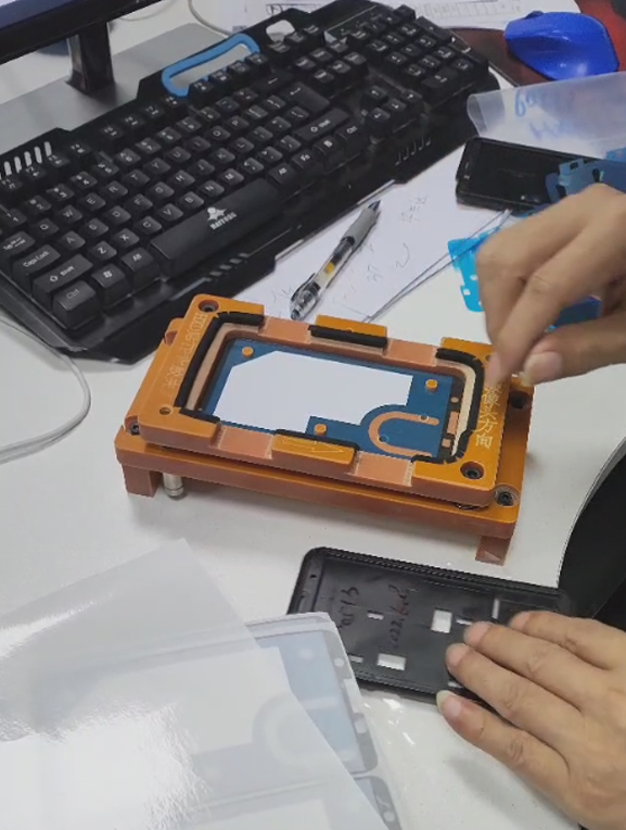 第一我們要依據(jù)顧客的產(chǎn)品制作一個夾具。把生產(chǎn)制造好的TP背膠膜放進夾具中。隨后認真觀察是不是放擺正 。然后把殼體放進夾具中。徹底壓合TP背膠。拿手用勁壓下去。隨后拿起來觀察背膠是不是和殼體徹底符合到一起。查驗并沒有問題了。從U型口處撕下外邊的膜。那樣背膠會轉(zhuǎn)載到殼體的邊沿部位。